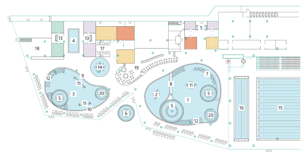 Lankytojų laukia net 11 skirtingų pirčių, 50-ies metrų Olimpinis baseinas, erdvus spa su baseinais, masažinėmis srovėmis, vaikų pramogų zona, restoranu, vandens barais bei vidaus ir lauko sūkurinėmis voniomis, su nuostabiu vaizdu į Nemuno salos gamtą.